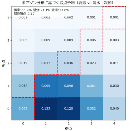 下のグラフはその一例で、鹿島が第28節で対戦する清水エスパルスとのスコア別確率を示したものだ。