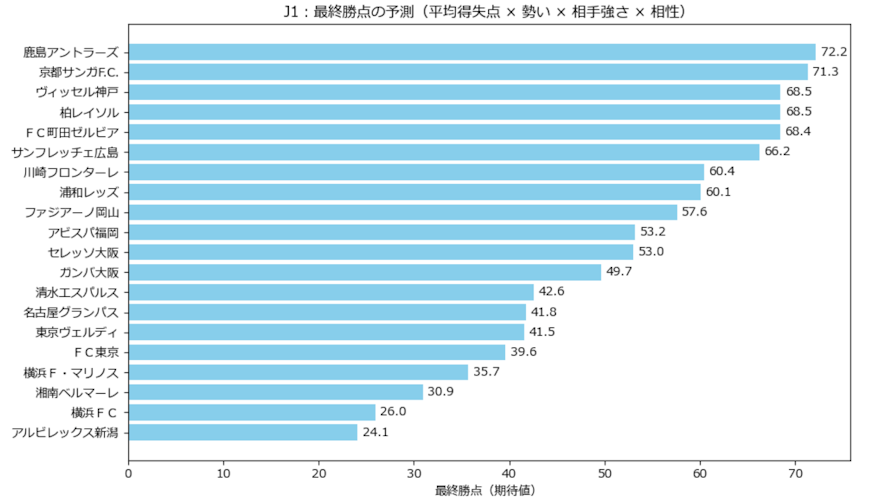 鹿島は残り11節で21.2ポイントを積み上げると予測され、最終勝点は72.2(≒72)。つまり「統計的に最も可能性の高いシナリオ」は、鹿島が72でシーズンを終える姿だった。