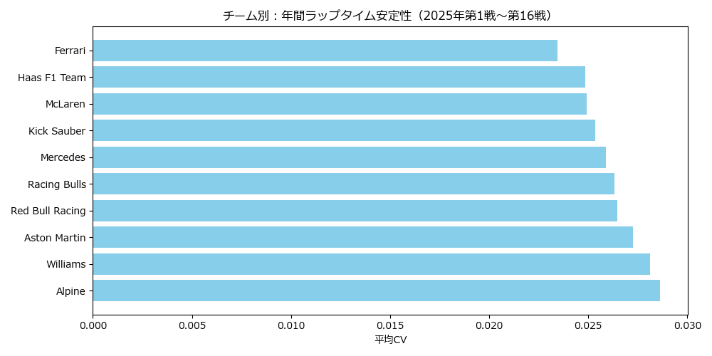 注目すべきはハースの存在だ。ポイント面では決して目立っていないが、安定性ではトップクラスの数値を記録している。その背景には、ドライバーの堅実な走りだけでなく、マシンが一定の条件下で安定した挙動を示す特性があると考えられる。エアロバランスやトラクション性能は突出しないものの、乱れの少ないマシン特性は安定的なラップタイムに寄与する。また、大胆な戦略を取らず「確実な走行」を重視するチーム方針も、CV値の向上に一役買っている可能性が高い。